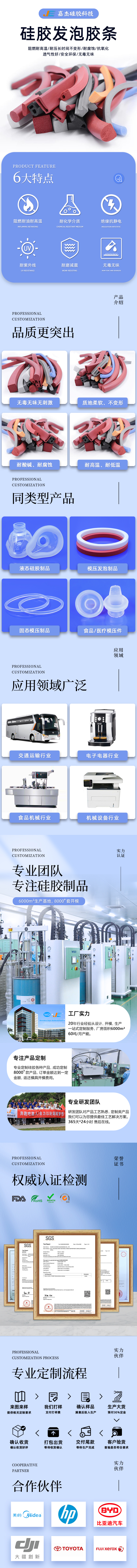 由于異型硅膠發泡條是硅膠原材料加入發泡劑制作而成,所以一般也稱為發泡硅膠條。我廠硅膠海綿條、硅膠海綿帶等產品均是采用100%g氣相硅膠原材料加入發泡劑經過經由高溫烘烤箱硫化,在硫化過程中產生大量的空氣,致使硅膠內部產生大量的小孔而制成,產品最大特點就是耐高溫、彈性好,優質的耐高溫硅膠海綿條可在300度高溫下持續工作不變質。 深圳嘉杰是廣東深圳地區專業的硅膠制品生產制造供應廠商,我廠硅膠制品主要包括硅膠管、led硅膠套管、硅膠密封圈條等系列,生產的led鉑金硅膠套管、進口硅膠密封條等產品均是大量熱銷產品,有大量現貨庫存,歡迎詢價!